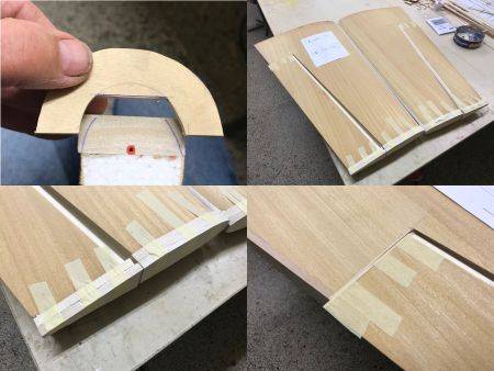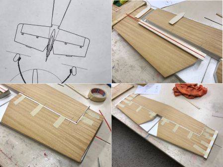 Aus 15mm Balsa werden 45mm breite Leisten von einem leichten Balsabrett zugesägt und gleich mittig geschlitzt für das Bowdenzugrohr. An der Stelle, wo später das Ruderhorn den Platz findet, wird eine Platte aus 6mm Pappelsperrholz eingesetzt. Die Platte wird dann mit eingedicktem Harz eingeklebt. Das Rohr wird mit Uhu-plus in den Schlitz geklebt und danach die Leiste mit Weißleim an die Querruder geklebt. Mit einigen Klebebänder wird die angeklebte Leiste gesichert, danach aufgestellt und mit einige Gewichten beschwert. Alles kann nun trocknen bis zum nächsten Bauabend.
