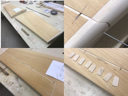 Heute halte ich alleine die Stellung und es ist das Verrunden der Randbögen angesagt. Die zuletzt angeklebten Randbögen werden eben zu der Tragfläche geraspelt und geschliffen und danach verrundet. Das Scheifen der Hohlkehle in den Randbogen erfordert die meiste Sorgfalt. Dann wird die Stellung der Scharniere angezeichnet. An der Kreissäge wird das Sägeplatt auf 25mm eingestellt und dann die Querruder geschlitzt. 8 Sperrholzteile, 3mm stark werden zugesägt und in Form geschliffen. Leider ist es schon wieder 20 Uhr und die Tagesschau samt Wettervorhersage ruft.