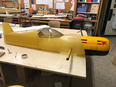 Mittlerweile wurden 4 Rudermaschinen im Heck eingebaut und eine Abdeckung an der Unterseite vom Rumpf hergestellt. Diese wurde mit GFK überzogen und mit 4 Schrauben befestigt. So kommt man von untern an das Rumpfvorderteil, wenn es mal was zu montieren gibt. Die Höhenruder habe ich mit nach Hause genommen, um diese über das Wochenende zu bespannen.