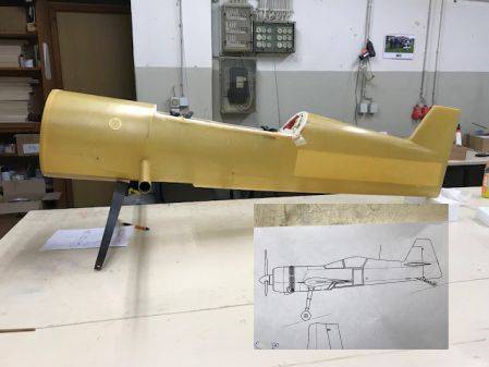 Die letzten Tage wurde schon mal die Motorhaube angepasst. Diese wird ca. 100mm von vorne über den Rumpt geschoben. Anhand der 3-Seitenansicht wurde das Maß umgerechnet und die Haube danach ausgerichtet. Nun kann ich das Maß vom Motorspant bis zur Vorderkante der Motorhaube abnehmen, um  Zuhause die Motohalterungen herzustellen. Da ich an der Oberseite den Kabinendeckel abnehmbar gestalten möchten, wird die Kabinenhaube schon mal grob vorgeschnitten.