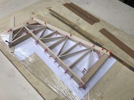 Nach dem Verputzen vom Sägeschnitt wurden die Halbspanten hinten und vorne eingepasst und eingeklebt. Auf diesen Rahmen kommen nun wieder rechts und links 2 Leisten und vorn und hinten nochmals 2 Spanten. Die vorderen 2 Spanten werden gleich mit 2 Buchendübel versehen. Zusammen mit der unterlegten Folie kann der Rahmen trocken. Auf diesen Kabinenramen wird dann später wieder das ausgesägte GFK-Cockpit aufgeklebt.