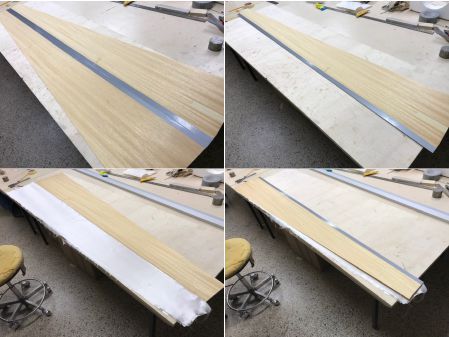 30.01.2019 - auch am Flügel der ASW-22 und der Foka geht es heute weiter. Das Beplankungsmaterial wurde heute geliefert und wird gleich in die passende Form geschnitten. Dies geschieht sinnvolerweise im Packet. Dann legen wir Rowings aus Kohlefaser an der Ober- und Unterseite vom Holm. Stirnseitig wird eine Füllstück für die Steckung gerichtet. Eine Schraube wird stirnseitig hineingeschraubt. Daran kann der Kohlerowing angebunden werden. Auf der Gegenseite vom Holm wird eine Aussparung mit Rundfeile gefeilt. Dann können die Rowings unter Zug oben und unten auf den Holm gewickelt werden. Schlussenlich werden nach 5 Lagen die Enden verknüpft. Schon jetzt ist die Festigkeitserhöhung vom Holm beim Durchbiegen spürbar. Beim Aufziehen der Beplankung werden die Kohlefaser mit Epoxy getränkt. Doch mehr dazu später. Für Heute schlägt die Uhr schon wieder 8. 01.02.2019 - den heutigen Abend treffen wir nochmals Vorbereitungen, bevor die Flügel unter die Presse kommen. An den Beplankungen werden die Hinterkanten gerade geholbelt. Mit unserem langen Lineal wird dies kontrolliert. Anschließend wird die Beplankung mit einem Spalt der Furnierstärke auf den Tisch gelegt und mit Panzertape zusammengekelbt. Nach dem Zusammenklappen ergibt dies eine Gerade Hinterkante. Nun wird 105 Gramm Köpergewebe in Form der Beplankung zugeschnitten. Und schon wieder sind 3 Stunden rum und ich frage mich: was wurde heute geschafft? Die Beplankung der ASW-22 muss auch noch vorbereitet werden. Das geschieht in diesem Fall am nächsten Abend. |