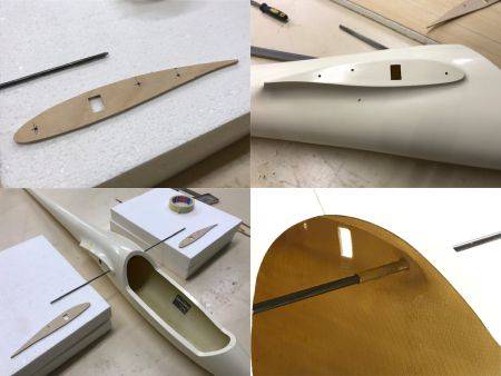Schön zu sehen sind die 4mm-Bolzen, welche für die Arretierung der Flügel gedacht sind. Die hintere besteht aus 4mm Federstahl, die vordere ist eine M4-Gewindestange. Diese wird gleichzeitig als Sicherung, gegen das Herausrutschen verwendet, indem eine Mutter darauf gedreht wid. Die am letzten Abend verleimte Auflage für das Pendelruder ist auch toll geworden. Daher kann heute die Wippe fertig gestellt werden. Beim Verleimen mit Uhu-Plus ist eine Distanz dazwischen geschraubt. Diese ist gleich breit, wie die Dämpfungsfläche vom Seitenleitwerk. Zuhause drehe ich mir dann schon mal die Lagerung aus Messing. Die Aussparung für das Seitenruder wird noch angezeichnet und herausgeschnitten. Anschließend wird diese mit Furnier beklebt. Das Ankleben der beiden Randbögen erfolgt gerade noch rechtzeitig vor dem Feierabend. Joachim will Morgen seine Steckung fertig stellen. Bin schon gespannt auf das Ergebnis am Freitag. 11.03.2019 - heute wird die Wippe für das Pendlruder demoniert. Bei der Verklebung ist ein bisschen Kleber in die Lagerung gelangt. Nach einiger Fummelei ist dann alles wieder beweglich. Der Segler wird kurz aufgebaut, die EWD ausgerichtet und die Höhe vom Seitenruder gemessen. Dies endet ja an der Oberseite vom Höhenleitwerk. Dann wird das Seitenruder in Stegbauweise gebaut. Abschließend wird gleich noch eine Nut für das Bowdenzugrohr in eine Balsaleiste gesägt und dieses mit Uhu-Plus in die Leiste geklebt. Damit werden wir später die spaltfreie Ruderanlenkung herstellen. Abschließend wird noch die Leiste für die Dämpfungfläche vom Seitenruder eingepasst und schon mal geschaut wo wir die Rudermaschine für das Pendelruder platzieren wird. Das wird am nächsten Abend das Thema sein. Joachim hat seine DG-800 mal auf die Seite gelegt. Er baut sich nun erst mal einen Kobuz für seinen nächsten Urlaub. Der Rumpf ist aus GFK. Die Flügel sind schon in RG-14 aus Styropor geschnitten. |