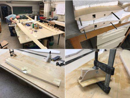 15.02.2019 - Joachim baut heute den Großsegler auf. Dazu werden alle Tische abgeräumt. Gar nicht so einfach die Flügel mit der Holmbrücke anzupassen. Der Flügel wird mit einer Schnur zum Leitwerk hin vermessen. Einige Flüllklötze zwischen Rumpf und Flügel werden eingepasst und an den Flügel angeklebt. Da ist noch Einiges zu tun, bis der Flügel schlussendlich an den Rumpf passt. Das heute war erst der Anfang. Die Flügel der Foka werden heute für die Nasenleiste besägt. Dies geschieht wieder in der gleichen Art, wie schon beim Höhenleitwerk. Aus einer 2,5 Meter langen Kantholz aus Kiefer wird ein Holm 15x6 aufgesägt. Dieser wir mit Weißleim an den Flügel geklebt. Mit einigen Klebandstücken wird die Nasenleiste gesichert. Schon mal eine Zwischenbilanz zu den Tragflügel der Foka. Diese sind mit 1100 Gramm pro Flügel doch recht schwer geworden. Dafür sind diese sehr stabil. Ist bei diesem Flieger vielleicht für den Durchzug beim Kunstflug nicht schlecht. Bei der ASW-22 werde ich nur noch Glasgewebe im Ruderbereich und weniger Harz verwenden. Bei der Foka waren es doch 150 Gramm pro Flügel. 18.02.2018 - Joachim passt heute seine Flügel an der Rumpf an. Daher ist weniger Platz. Also werden heute erst mal die Nasenleisten der Foka in Form gebracht. Dies geschieht recht schnell mit dem Hobel und etwas Gefühl. Abschließend wird mit der langen Schleifleiste die Nasenleiste verrundet und nachgeschliffen, bis ich zufrieden bin. Das benötigt doch noch einige Zeit. Die Zeit reicht heute noch. um die Nasenleisten der Höhenleitwerke in Form zu bringen. Dann ist es auch schon wieder 20 Uhr und Feierabend. Joachim ist heute auch ein Stück weiter gekommen. Das mit der Flügelanformung an den Rumpf sieht schon recht gut aus. 20.02.2018 - Der Segler von Joachim belegt immer noch mehrere Tische, um die Tragflügel an den Rumpf anzupassen. Nicht so schlimm. So kann ich die Nasenleiste vom letzten Höhenleitwerk noch fertig stellen. Dann werden alle Leitwerke gleich mit dem Schwingschleifer überschliffen. Damit ist die Oberfläche bügelfertig. Die Leitwerke werden auf die Seite gelegt. Dann werden die Beplankungen der ASW-22 vorbereitet und die Gewebezuschnitte passend geschnitten. Am Freitag möchte ich die Flügel der ASW-22 entgültig pressen. Dann sollte wieder Platz auf den Tischen sein. Die Tragflügel der Foka sind übrigens toll geworden. Joachim hat die Stahlsteckung 15x10mm in der Mitte um 3 Grad gekantet. Heute kann ich die Flügel mal zusammenstecken. Das sieht ja recht gut aus. Doch ist mir leider ein kleiner Fehler unterlaufen. Die Vorderkante sollte ja gerade sein. An meiner Foka ist dies leider nicht. Ich habe den Hauptholm in das erste Drittel gesetzt. Auch nicht so schlimm. Dann sieht der Flieger eben eher wie eine Lunak aus und ich benötige vorne weniger Gewicht. |