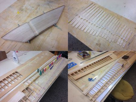 19.10.2016 - heute besucht uns Rolf in den Bauräumen. Er möchte zukünftig auch bei uns am Freitag bauen. Damit sind nun alle 4 Plätze belegt. Wenn nun noch jemand hinzu kommt, müssen wir den Platz wieder nach dem Bauen abräumen und unser Baubrett auf die Ablagetische ablegen. Auch mit der Reparatur vom 5-Meter Motorspatz bin ich weiter gekommen. Der Rippensatz wurde im Block erstellt und die fehlende Nasenleiste und Endleiste wieder angesetzt. Unter die Endleiste habe ich gleich wieder die Beplankung geklebt. Der untere Hauptholm 10x5mm wurde geschäftet und dann 2 Hauptholme 5x5mm versetzt angeklebt. Das sollte auf jeden Fall halten. Während der Trockenzeit wird schon mal ein Keil auf der Kreissäge gesägt. Dieser wird dann unter der Endleiste unterlegt, damit der Flügel die gewünschte Schränkung bekommt. Nachdem die angesetzten Holme trocken sind, können alle Rippen eingepasst und danch eingklebt werden. Abschließend wird noch schnell der obere Hauptholm aus 2 Kiefernleisten 5x5mm eingesetzt. Auch dieser ist in der gleichen Art geschäftet, wie der untere Hauptholm. Natürlich an einer anderen Stelle. Für heute habe ich mein Soll erfüllt. Es wird noch schnell das Werkzeug versorgt und der Arbeitsplatz aufgeräumt. Soviel Zeit muss sein. Am Freitag geht es weiter. 24.10.2016 - mittlerweile wurde die Tragfläche vom Spatz unten mit 2mm Balsa beplankt und alle Aufleimer angepasst und eingeklebt. Heute wird der Flügel auf dem Baubrett aufgespannt und an der Hinterkante den Keil für die Schränkung unterlegt. Die Endleiste wird eben zu den Rippen geschliffen und die Nasenleiste schräg, damit die Beplankung schön anliegt. Dann kann die Nasenleistenbeplankung mit Weisleim aufgeklebt werden. Anschließend noch die Endleistenbeplankung und abschließend die Aufleimer und die Beplankung am Knick. Alles liegt schöne auf und kann trocknen. Gerade haben wir das noch vor 20 Uhr geschafft. Ein bischen Reinemachen und das war es dann auch schon wieder. |