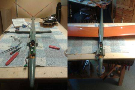09.11.2016 - und schon beweist sich mal wieder, wie toll sich die Solartexfolie von robbe verarbeiten lässt. Gerade mal 2 Abende und schon sind 5 Meter Folie verarbeitet. Das Ergebnis ist einfach genial und schon sieht die Oberfläche aus, als wäre die Tragfläche mit Seide bespannt. Nur mit dem kleinen Unterschied, der Arbeitsaufwand ist wesentlich geringer. 13.11.2016 - nachdem wir am Samstag noch auf dem Modellflugplatz waren, finden wir uns heute zu viert in den Bauräumen ein. Die Rudermaschinenbefestigungen wurden das letzte Mal noch grau lackiert. Die Kabel sind angelötet und mit Schrumpfschlauch versehen. Nachdem die Mittelstellung mit dem Servotester eingestellt ist, können die Rudermaschinen dann mit samt dem Deckel an der Tragfläche festgeschraubt werden. Ich denke, noch ein Abend, dann ist es geschafft und ich kann mich endlich meinem neuen Projekt widmen. Momentan bin ich an der Vorbereitungen für das nächste Vereinsprojekt. |