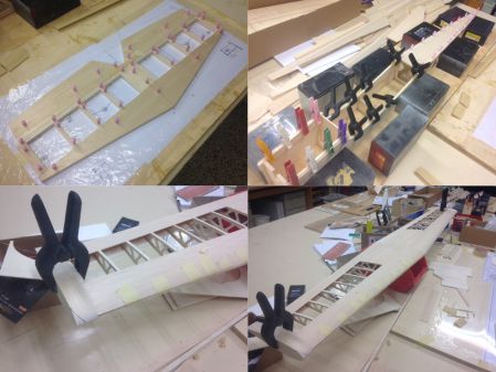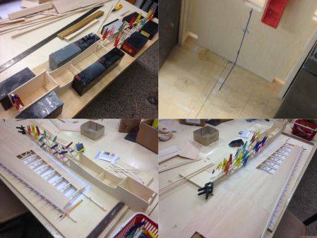 07.02.2017 - als heutiges Ziel möchten wir die Unterseite fertig beplankt haben. Daher gehen wir gleich ans Werk. An 2 Plätzen legen wir los. Die Beplankungsbretter werden gleichzeitig im Paket zugeschnitten. Die Beplankung wird an der Außenseite leicht angefeuchtet. Dadurch wird diese flexibel. Die Rippen werden auf den 1,5mm dicken Baslabretter angezeichnet, an den Rippen und an den Markierungen Pattex aufgetragen. An den Holmen verwenden wir Weißleim, an der Nasenleiste geben wir Uhu - hart an. Die Beplankung wird aufgesetzt, an Nasenleiste und dem Hauptholm Zulagen angebracht und dann mit Wäscheklämmern gesichert. Da wir rationell vorgegangen sind, haben wir unser Ziel gegen 20 Uhr erreicht. Die Unterseite der Tragflügel sind beplankt. Am Freitag müssen wir nur noch die Aufleimer aufbringen. Dann können wir die Oberseite fertig stellen. 10.02.2017 - heute geht es an die erste Oberseite der Tragflügel. An zwei Stationen wird die eine Seite der Tragfläche wieder aufgespannt und die obere Beplankung aufgezogen. Da die Beplankungszuschnitte gleich für beide Flügel vorbereitet werden, geht das recht schnell. Noch die mittlere Beplankung aufgezogen und die Aufleimer draufgeklebt, dann ist es auch schon wieder 20 Uhr und unser Tageszeil ist erreicht. Am Montag geht es wieder weiter mit der 2. Flächenhälfte. Jetzt ist erst mal Wochenende. 13.02.2017 - heute wird die 2. Oberseite vom Tragflügel beplankt. Auch hier wird der Flügel wieder auf dem Baubrett aufgespannt, um gerade zu bleiben. Dann wird in der gleichen Art, wie schon beim letzten Mal, die Beplankung aufgezogen. Das Baubrett wird beiseite gelegt und der Zusammenbau vom Rumpf angegangen. Eine Mittellinie wird auf dem Baubrett gezogen, an den Spanten wird die Mitte angezeichnet, die Schlitze an den Seitenteilen nachgefeilt und schon kann der Rumpf mit Weißleim zusammen geklebt werden. Damit der Rumpf gerade bleibt, werden beidseitig Akkus plaziert. Diese schmeißen wir nicht weg, sondern verwenden diese in den Bauräumen. Da die Spanten nun an der Mittellinie ausgerichtet sind, erhalten wir nun einen geraden Rumpf. Abschließend werden noch an der Unterseite die 5x5mm Leisten angeklebt und schon ist es wieder Feierabend. |