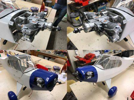 Nachdem ja der Innenraum der Piper grundiert und mit Effektlack ausgekleidet wurde kann ich schon wieder an die Bespannung schreiten. Die Piper soll komplett weiss werden und nur einige Verziehrungen und Schriftzüge bekommen. Gegen Feierabend ist das Höhen- und Seitenleitwerk samt Ruder bespannt. Dann kann es ja den nächsten Abend schon mit dem Rumpf weiter gehen. Ich freue mich schon drauf. 24.04.2017 - die Motorbefestigung wurde daheim vorbereitet und kann heute angepasst werden. Die Auspuffrohre werden durch den Rumpf geführt und schauen dann unten heraus. Bis diese passen habe ich sicherlich 10 Mal den Motor vom Rumpf wieder weggeschraubt. Dann ist es endlich soweit. Es scheint alles zu passen. Durchbrüche für die Kerzenstecker werden gebohrt und gefeilt. Die Zündung kommt in den Rumpf. Daneben dann der Akku. Einen neuen Tank muss ich erst noch bestellen. Der alte ist dahin. Das Drosselservo kommt auf die Rückseite der Halteplatte. Das erledige ich wieder Zuhause. Haltewinkel für die Motorhaube werden ich dann auch gleich herstellen und diese mit der Haube verschrauben. Distanzen aus Polyamid, 10mm stark müssen noch gedreht werden. Dann kann ich am nächsten Abend den Motor entgültig anpassen und den Motor - Innenraum lackieren. 26.04.2017 - Halterungen aus Alu wurden für die Motorhaube Zuhause hergestellt. Diese werden heute am Motorspant verschraubt. Dazu werden die Durchgangsbohrungen an der Motorhaube nachgefeilt, bis die Ausparung von der Propellaufnahme mittig sitzt. Nun werden die Kotflügelscheiben mit Uhu-Plus auf die Motohaube geklebt. Später werden dann die ganzen Löcher der Vergangenheit von innen mit Glasgewebe ausgelegt, von außen verspachtelt und verschliffen. Dann kann die Haube schlussendlich neu lackiert werden. Und schon wieder ist der Abend rum und es geht wieder nach Hause. |