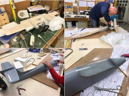 25.10.2017 - Joachim ist wieder einen großen Schritt weitergekommen. Die Presse war einige Abende aufgebaut. Mit dieser wurden die Einzelteile der Tragflächen unten beplankt. Danach wurden die Schlitze für die Kabel gefertigt und abschließend die Oberseite beplankt. Nun sind die Flügel schön gerade und können sich sehen lassen. Nur noch einige Kleinarbeiten sind zu erledigen. Doch diese nehmen, wie wir wissen, ja bekantlich auch noch einige Zeit in Anspruch. Doch wir können uns Zeit lassen, gemäß dem Motto: Modellbau entspannt und macht Spaß. Bin schon gespannt auf den nächsten Abend. Joachim hat ja viel Zeit für den Modellbau. Manche sagen schon: er übernachtet in den Bauräumen. 11.11.2017 - Beginn der fünften Jahreszeit. Draußen regnet Bindfäden, unterstützt vom kräftigen Wind. Hier in den Bauräumen ist es mollig warm. Joachim kommt wieder seiner Lieblingsbeschäftigung nach. Er bespannt die Tragflächen mit Kunstseide. Das Gewebe wird an den Rändern mit Weißleim festgeklebt. Anschließen wird die Seide mit Spannlack gespannt. Das hört sich hier so einfach an. In Wirklichkeit ist das doch recht aufwendig. Ich selbst hätte da nicht den Nerv dazu. Ich würde den Flieger kurzerhand mit Gewebefolie bespannen. Doch bei uns wird keiner zu etwas gezwungen. Jeder wie er will und kann! 24.11.2017 - mit jedem Besuch in den Bauräumen bin ich über den Fortschritt der Kollegen erstaunt. Das letzte Mal hat Jochachim noch den Flieger bespannt. Heute ist schon die graue Farbe drauf. Die Servos sich schon drin und die Kabel sind schon weitgehend angeschlossen. Da wir heute die Tiefziehmaschine aufgebaut haben, ziehen wir gleich noch eine Kabinenhaube mit. Und diese passt wie angegossen. Ja Joachim, da steht ja wohl bald der Erstflug an. Vielleicht sogar im Schnee. Der Wetterbericht sagt ja den Winter voraus. |