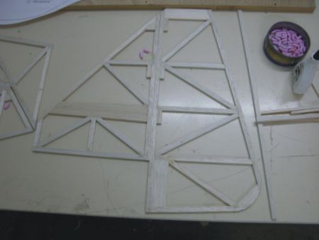 | Am Nebentisch legt Alexander los. Nach zwei Abenden sind bereits das Höhen- und Seitenleitwerk gebaut. Das erste Rumpfseitenteil ist fertig. Auch Moritz kann es nicht erwarten. In den Baupausen der Me-109 hat er schon mal einige Teile vom Doppeldecker hergestellt und hinter seinem Material - Vorratslager versteckt. Für das Foto habe ich die Teile etwas freigelegt. Moritz ist unser Jugendwart und hat den Schlüssel für die Bauräume. Er legt öfters eine Sonderschicht ein. Es ist wieder zu befürchten, dass sein Modell auch als erstes fertig ist. Mal schauen was uns da noch einfällt. | |