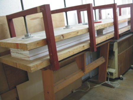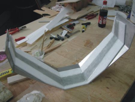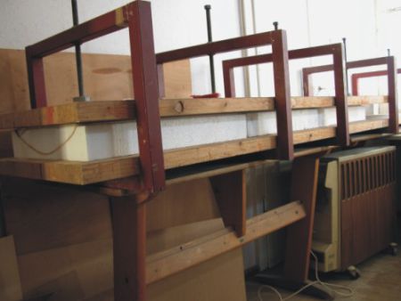 | Mit Zulagen versehen liegen immer 3 Formteile unter der Presse und trocken über die Nacht - die vorderen Seitenteile , die hinteren Seitenteile und das obere Rumpfvorderteil. Nach der Trockenzeit werden die Beplankungen bündig mit der Styropor geschliffen. Mit der Styroporschneidemaschine schneiden wir die Seitenteile wieder in 2 Teile. | |