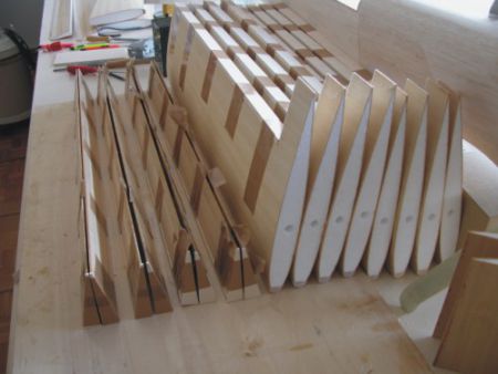 | Der Rumpf wird abgespannt und die Diagonalverstärkungen an der Unterseite angebracht. Der Rumpf trocknet. Nach Plan wird der Motorspant hergestellt und in die Motorhaube eingepasst. Im unteren Bereich muss am Spant ca. 3mm / Seite abgenommen werden. Dann passt die Haube saugend. Danach werden gleich für alle Modelle die Motorspanten hergestellt. Der Bau der weiteren Ultimate soll ja mal zügig voran gehen. | |