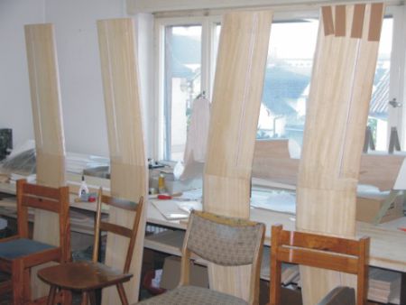 | Die Seitenteile sind an das Rumpfgerüst angepasst. Der Motorspant wird nochmals mit dem Winkel ausgerichtet und anschließend mit eingedicktem Epoxydharz angeklebt. Mit Klebeband werden die Seitenteile bis zur Aushärtung gesichert. Rumpf Nr. 3 hat somit den gleichen Fertigungsstand wie die anderen zwei. Zur Stabilisierung wurden in den Rumpf zwei Seitenteile aus Pappelsperrholz geklebt. Diese werden später mit Glasgewebe, zusammen mit dem Fahrwerksbrett überzogen. Für das Foto wurden alle Teile auf dem Tisch aufgereiht. Langsam nimmt der Flieger seine Formen an. | |