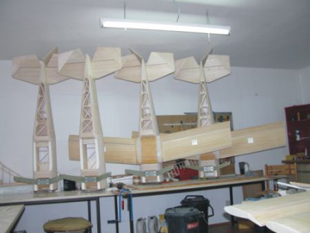 Bei den ersten 4 Tragflächen werden die Übergänge zum Mittelstück mit 2-Komponenntenspachtel angespachtelt und die zuvor eingeklebten Balsafüllungen für die Befestigung eben geschliffen. Im Bereich der Befestigungsschrauben werden 5 Lagen Gewebe aufgebracht, damit die Schraubenköpfe an dieser Stelle nicht ausreißen können. Mit einem 105-Gramm-Gewebe und Epoxy wird das Mittelstück und ca. 50mm von der Tragfläche beidseitig überzogen. Nur kleine Mengen vom Harz können angerührt werden, sonst härtet das Harz schon im Rührtopf aus. Zu Bauende ist die Oberfläche schon staubtrocken. Schön zu sehen auf dem Bild ist die waagrechte Verstärkung für die Dübel. Alexander hat das letzte Mal seine Tragflächen zusammengeklebt. Heute hat er diese verschliffen und ich habe ihm die Aussparungen mit der Oberfräse gefertigt. Abschließend klebt er noch alle Balsafüllungen in die Schlitze. Er kann am Donnerstag auch die Glasseide auflaminieren. 3 Doppeldecker sind bald bügelbereit. |