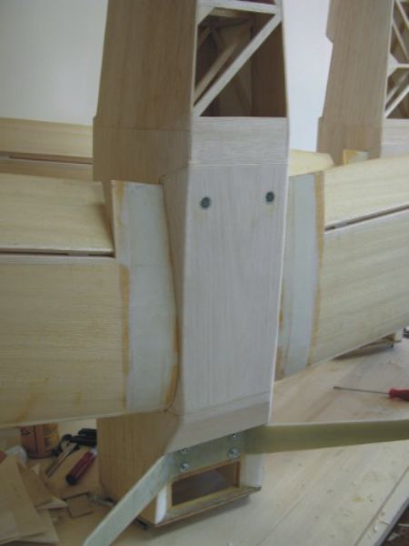 Zurück zum Modell - alle Aussparungen werden nach der Schablone 28mm tief gefräst. Die Schlitze für die Flächendistanzen sind 10mm breit. Diese werden ausgefüllt von je zwei 3mm Balsastreifen. Zur Verbindung der Flächenabstrebung wird ein 4mm Sperrholz verwendet welches aber erst nach der Bespannung hineingeklebt wird. Parallel zur Nasenleiste wird am Mittelstück ein Schlitz gefräst, hochkant ein Balsabrett eingepasst und geklebt. Diese Verstärkung sollen die Flächendübel abstützen. Die Dübel werden gebohrt, montiert und die Position am Rumpfspant angezeichnet. Die Bohrungen werden gebohrt und eventuell passend nachgefeilt. In den Rumpf wird ein 8mm Sperrholz klemmend eingepasst. Im Abstand von 80mm werden die Bohrungen für die M6 - Nylonschrauben in den Flügel gebohrt. Der Flügel wird aufgesetzt, mit der Schnur ausgerichtet und die Stellung abgebohrt. In das Sperrholz werden die Einschlagmuttern montiert und mit Epoxy eingeklebt. Das Sperrholz für die Flächenbefestigung kann nun mit Weisleim hineingeklebt werden. Für die Herstellung der Flächendistanzen bereiten wir Schablonen vor. Die ersten 2 Ausführungen dieser werden hergestellt und zusammengeklebt. Nun wird der Rumpf soweit unterbaut, dass das Höhenleitwerk eine Anstellung von +1,5 Grad aufweist. |